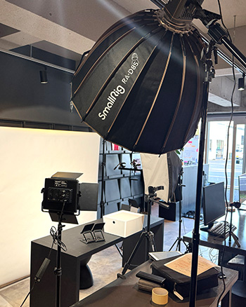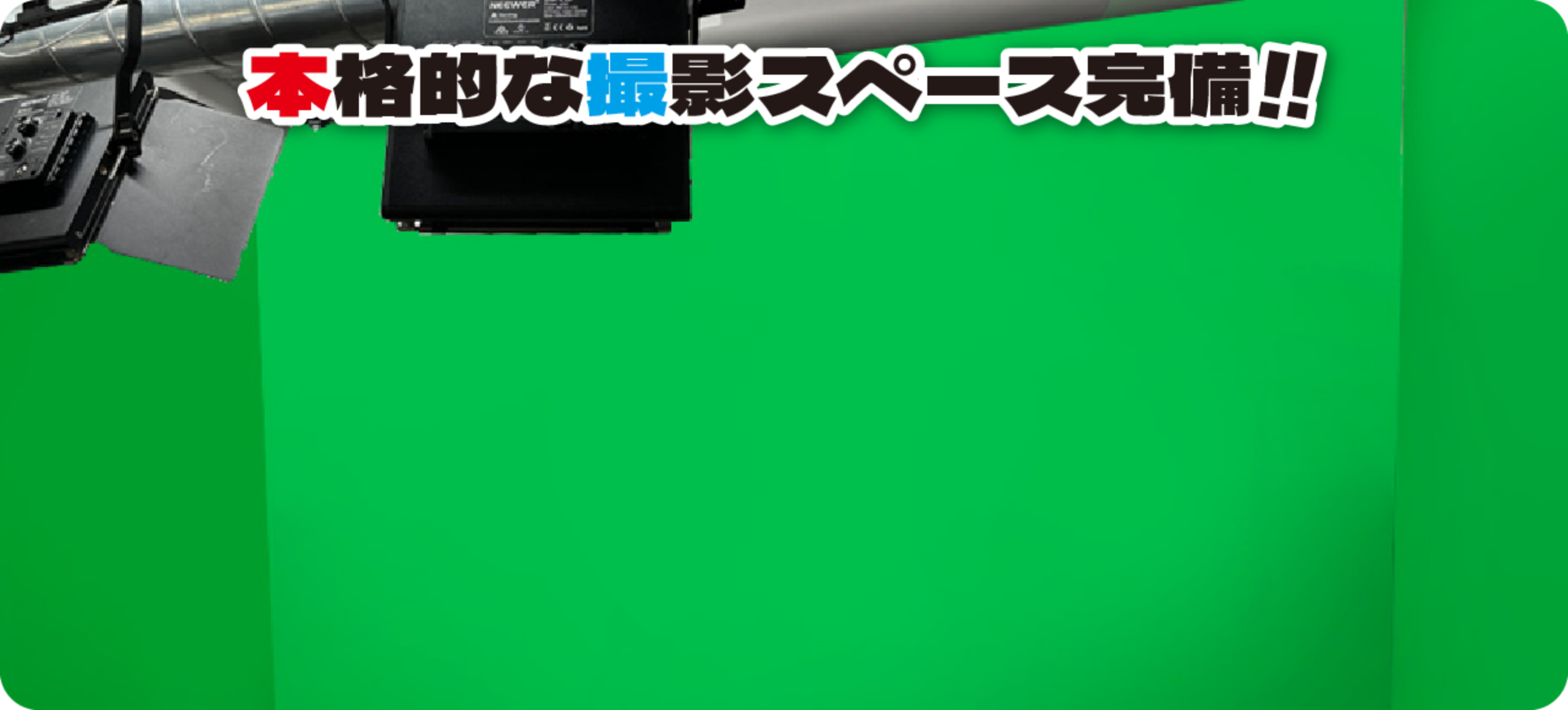 スタジオでは、クロマキー撮影に加えてVFX映像撮影も対応可能です。グリーンバックと専用照明を完備し、背景の合成や特殊効果が必要なプロジェクトに対応できるスタジオです。映画のような動画やおもしろ加工映像など、想像を具現化するに必要な撮影環境を整えています。スタッフ講師が、ライティングやカメラワークを含め、クロマキー撮影からVFX映像の制作までをトータルでサポートします。